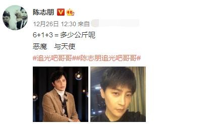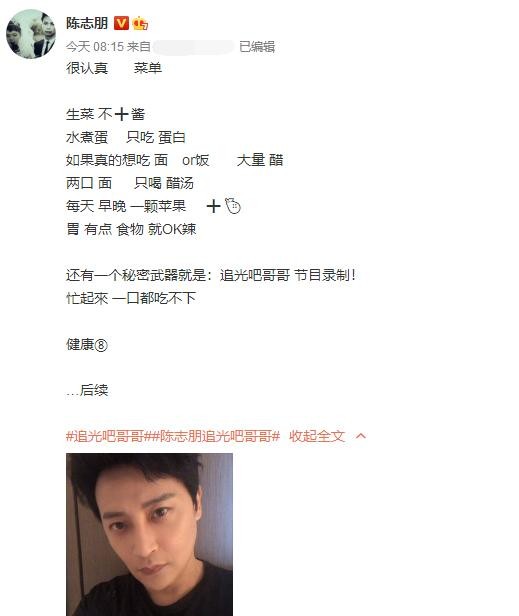 12月27日,陈志朋在社交平台上晒出了自己的瘦身食谱,并配文称"胃有点食物就OK辣","节目录制,忙起来一口都吃不下"。
