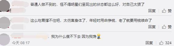 看到陈志朋的菜谱,网友们都不淡定了,有网友说"这么吃胃撑不住吧,太伤害身体了,年轻时用命挣钱,老了就要用钱续命了",也有网友评论说"普通人做不到的,怪不得明星们呈现出的状态都这么好,对自己太狠了"。