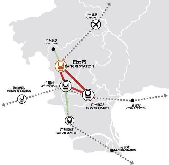 目前,广州是一线城市中唯一一个中心区没通高铁的城市,市民要乘坐高铁只能去到番禺区的广州南站、花都区的广州北站。中心区的广州东站只有有少量的和谐号线路。广州火车站也在规划改造升级,将来会引进部分高铁线路。