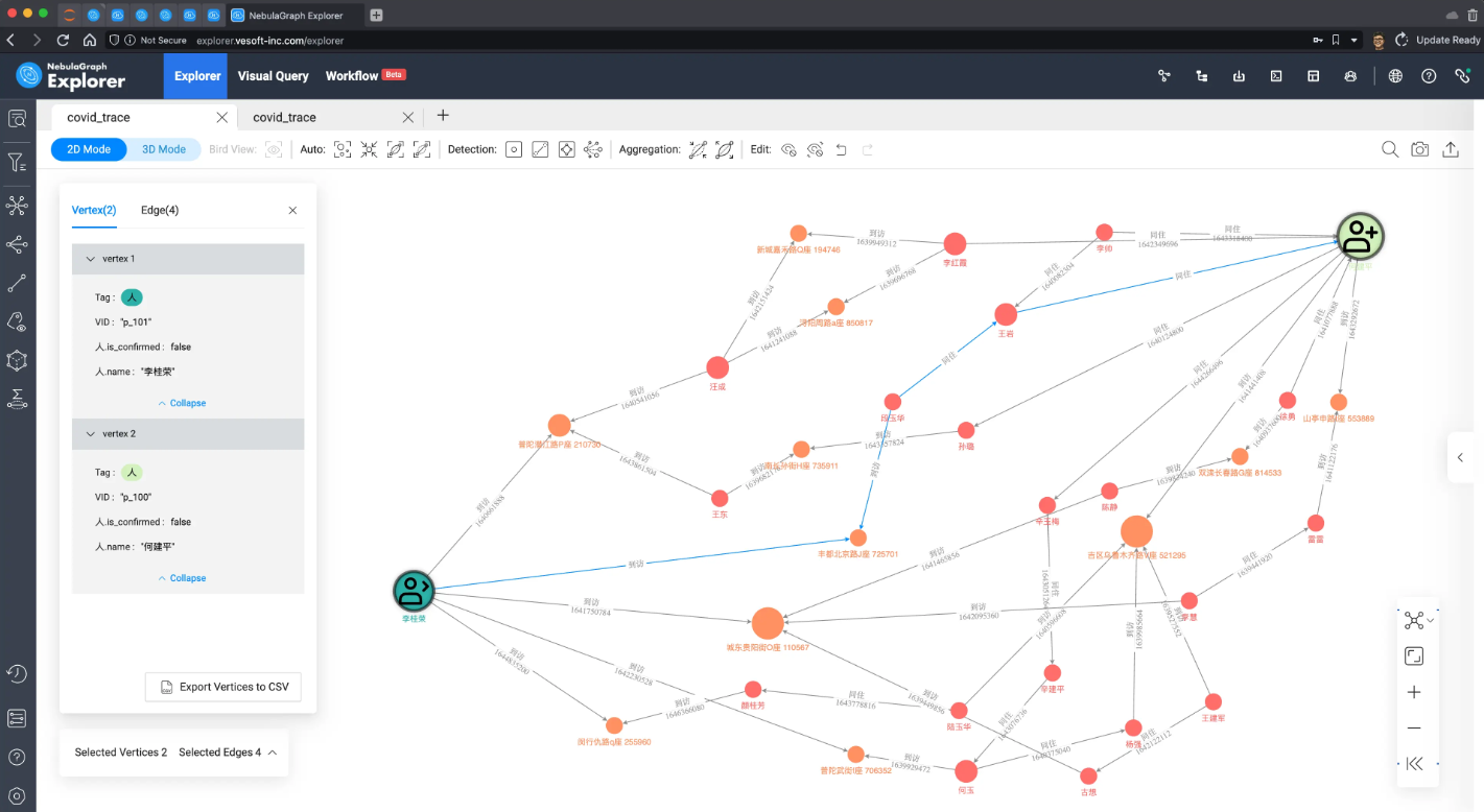 我们把所有路径进行可视化渲染,标记出起点、终点的两人,并在其中查到他们的最短路径。他们之间的千丝万缕关系就一目了然了,无论是商业洞察、公共安全还是疫情防控,有了这个信息,相应的工作都可以如虎添翼了。