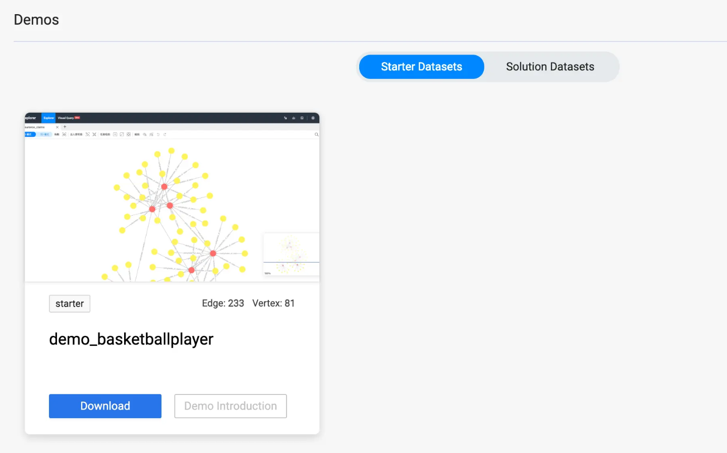 就可以导入数据。如果你使用了可视化图探索工具 NebulaGraph Studio / NebulaGraph Explorer,我们需要在欢迎页点击下载、部署这份基础数据集。