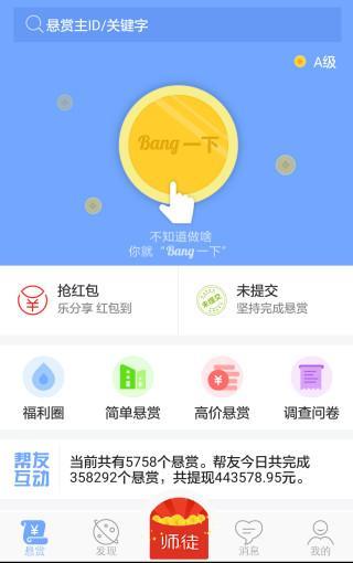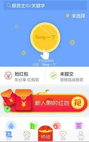 1、日常任务很多,可以点击首页的菜单,普通悬赏等等,也可以点击抢红包,这里的是做完任务后还有额外红包领取,都是有钱的任务主放的任务。另外还有一个很好的方式就是那个黄色的大按钮,bang一下,是随机获取任务,不用自己去找了,右上角有个未选择,点击一下,选取你想做的任务类型,短平快的就选A,如果想单价高,那么就选其他不同任务难度的选项。