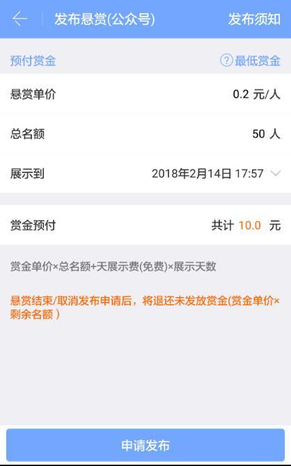 2.3 完成一个简单悬赏。按照指引来到简单悬赏页面,完成任务的步骤也基本就是日常做任务的步骤,先浏览看任务适不适合自己,想不想做,想做的话,点击最下方报名按钮。简单悬赏列表选一个微信关注类的好做的,进来之后,能看见要求,如下图这种简单的,立即报名后,二维码等显示出来,点击下载(保存图片),去微信扫二维码,完成任务,注意看要求截图是哪个,回来点击添加图片上传截图即可。任务要等任务主审核后,该任务才能完成,相应奖励入账。