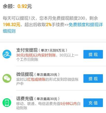 3.2 实名绑定后,每月有200元的免费提现额度,每日提现上限也相应提高。另外日常做任务,每做一个,免费额度都会增加。