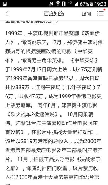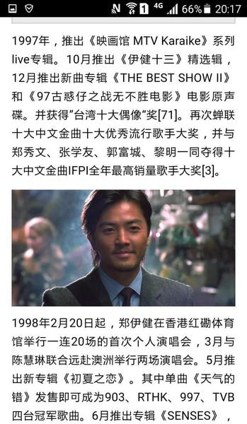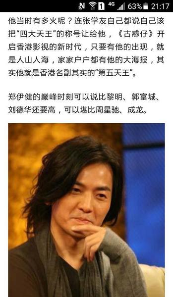 巅峰时期的郑伊健人气实在太高,黎明,郭富城,梁朝伟,张学友,刘德华,谢霆锋,张卫健,吴镇宇,都跟他演过电影,超级学校霸王,这是最早跟张学友,张卫健合演的,然后郑秀文跟梁朝伟 都有拍过戏,还有陈慧琳,吴倩莲,日本明星 小泽珍珠,张柏芝,合演东京攻略,最后是黎明的双雄,周秀娜 新星,古天乐,阿sa, 孙俪,提起郑伊健你以为只有最火的古惑仔票房那部,你就错了,那是你在内地知道香港有一位长发那么好看明星罢了,对他的长发印象开始而已,超级火的时候是拍风云时期那才是真的火,问鼎香港票房冠军4100万,整个香港1998年上映的电影对比过后,就他最卖的得电影之一,才有资格称为冠军对吧。然后歌曲奖项也不差,香港十大中文金曲,一首发现,当时有参加好几千个歌手歌曲就只有10首名额阿,十个明星能入围十大中文金曲都是厉害的角色,同时也是香港歌坛最有影响力颁奖典礼之一了,随后劲歌金曲季选,还有新城劲爆这些不是一个级别就不提了,1993年不要哭了,天气的错,这些都是热歌,发行第二张专辑地球也是,ifpi 销量冠军夺过,随后就是1997年跟黎明,张学友同时获得香港ifpi最畅销唱片 友情岁月大碟销量认证奖项。电视剧方面伊面很早就拍剧的伊面从1993年就有自己的作品面世,那个时候我才10岁,那些古装剧很多都无看过,反而11岁-12岁