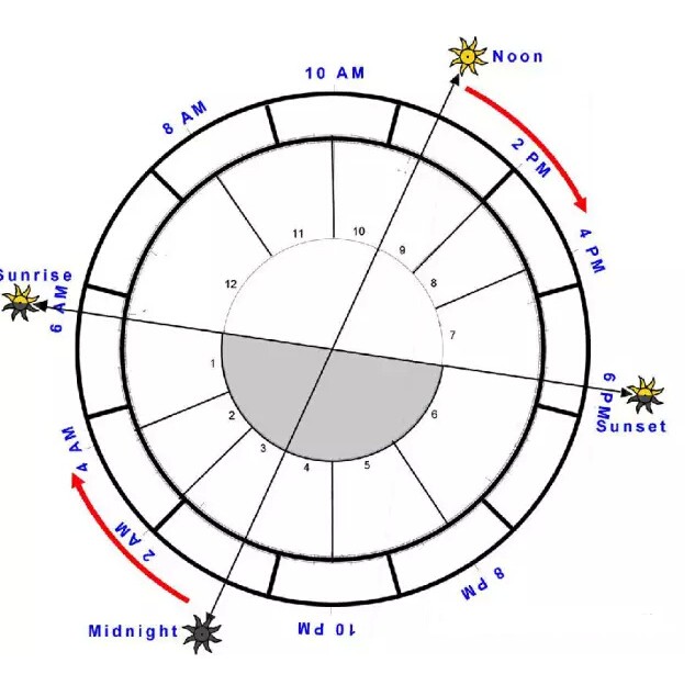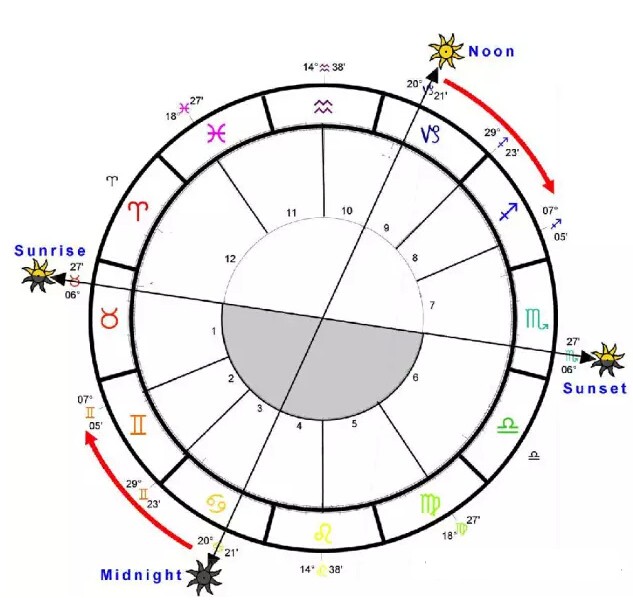 有一些人,出生在午夜的时候,太阳就是在最底端,有些人出生在正午就是中午12点,他们的星图就是在出生星图的最顶端也就是天顶。