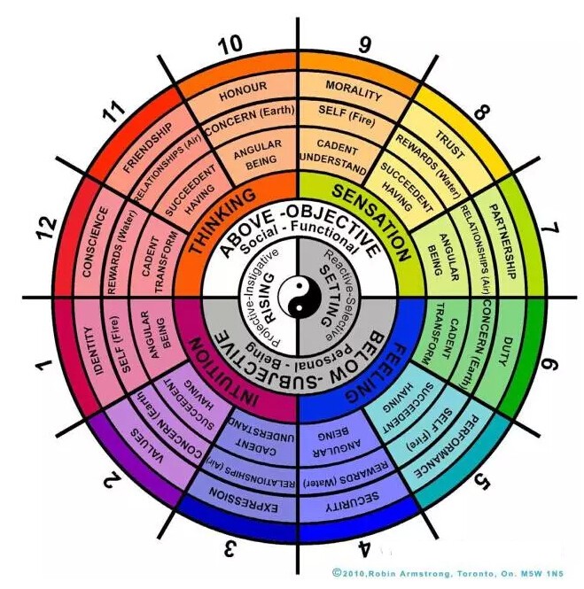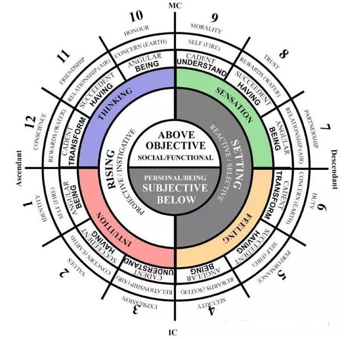我们可以看到,这个四种颜色的四个象限模块,我们从下面粉红色开始说,代表直觉,思想,感知,情绪。这是四种不同的心理机制,也是星图中的四分之一的象限。