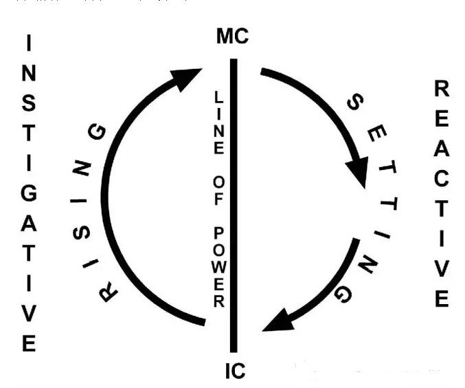 IC和MC中间的轴线叫做力量或权利的轴线。这有两种力量和能量,一种能量是中天天顶的能量是向外扩展的,那么另外一种能量是在IC,是在午夜的时候,午夜的能量是相对收缩的,是内观的能量。那么从IC到MC的过程中,我们可以想象,我们在午夜休息,能量是内缩的,然后我们起床,去吃饭,去工作,这样我们是把能量向外发散的过程。从中天MC到IC的过程中,实际上是我们跟外界去沟通去回馈,然后我们去做一些事情,最后我们去休息的过程。