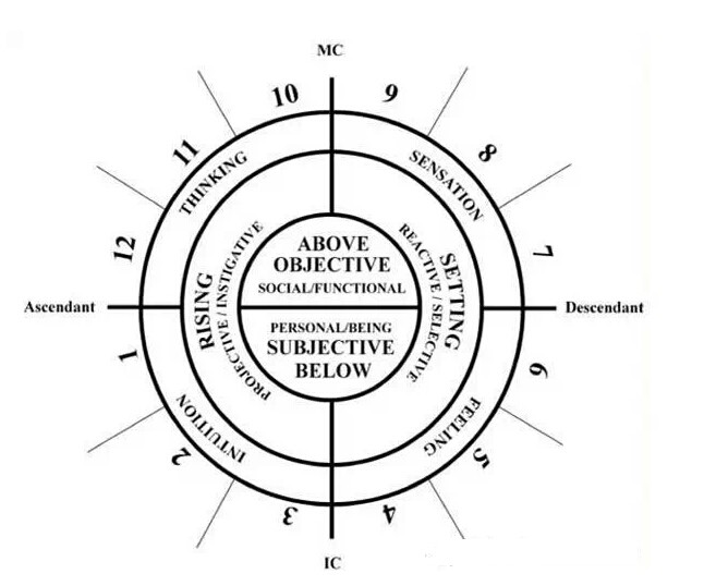 我们刚才讲到的上升、下降、主观、客观,还有四个象限代表的是直觉、思考、感知、情绪。那我们还可以看到说,第一个宫位是始宫,第二个是续宫,第三个是终宫,始宫,续宫,终宫,四五六也是这样延续的。