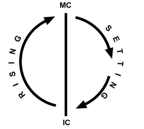 在星图中最高的部分,我们叫MC天顶,最低的部分我们叫IC天底,IC是最低点,也就是说是在地球最低端的点,大家可以看到,左边从天底到天顶也就是从IC到MC的过程是一个上升(rising)的过程,大家可以看到,升起的星座或者星体都是在东半球左半边,有一半边的出生星图是上升的;从MC天顶到IC天底,这一半的半球是下降(setting)的。上升和下降的概念是宫位的重要概念。你会了解行星在不同的半球,它的能量是不同的。