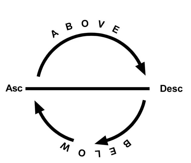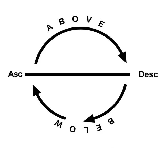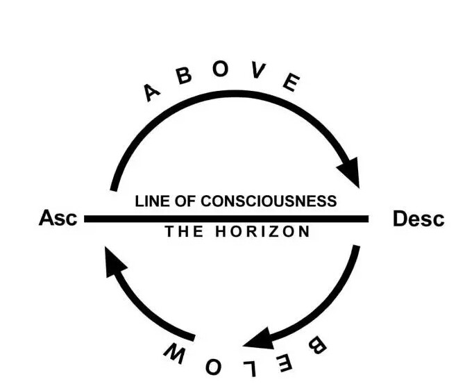 刚才就是简单总结了宫位的概念,我们会从上升,下降,地平线上和下,然后再分四个象限,这是我们所有解读星盘的基础。