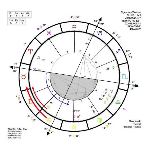 这张星图上有个蓝色的箭头,箭头所指的方向就是宫位的顺序,1,2,3,4,这就是地球在运转的方向,在地球运转的过程中,宫位也是这样转动的。