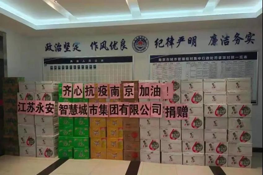 江苏永安集团通过南京市马群街道城市综合治理中心向南京抗疫一线医护工作人员及抗疫工作志愿者捐赠了饮用水、营养饮品等各类物资120箱。