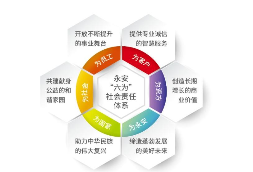 永安集团勇于承担社会责任,创立"六为"责任体系,以开放不断提升的事业舞台、提供专业诚信的的智慧服务、创造长期增长的商业价值、缔造蓬勃发展的美好未来、助力中华民族的伟大复兴、共建献身公益的和谐家园为核心价值观。
