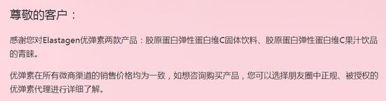 而曾有媒体报道称,优弹素的创始人就是Ayawawa的丈夫王鹏,而优弹素官网则显示,“优弹素在所有微商渠道的销售价格均为一致,如想咨询购买产品,您可以选择朋友圈中正规、被授权的优弹素代理进行详细了解”。