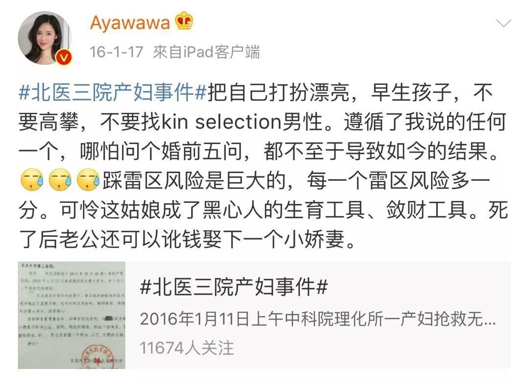 而早前南京曾发生过一起妻子被富二代老公20多刀致死的惨案,这在ayawawa的口中,那个杀人犯没有错,是因为妻子PU过高才导致的!