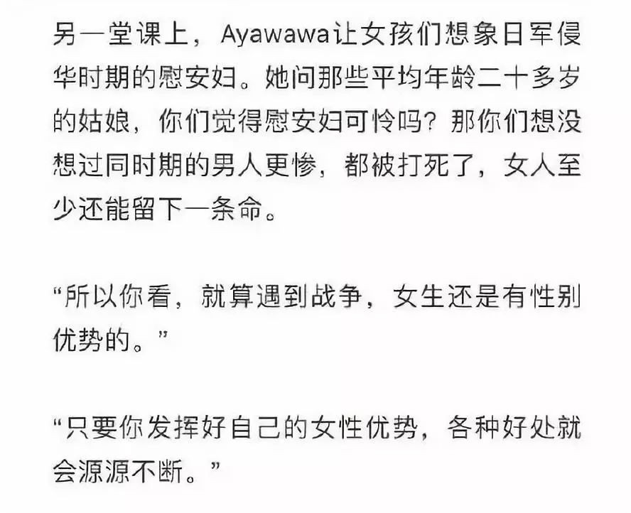可你要知道,这其实是早前她在一节开价16800的课上对她的“教徒”们说的:“你们觉得慰安妇可怜吗?那你们想没想过同时期的男人更惨,都被打死了,女人至少还能留下一条命。”