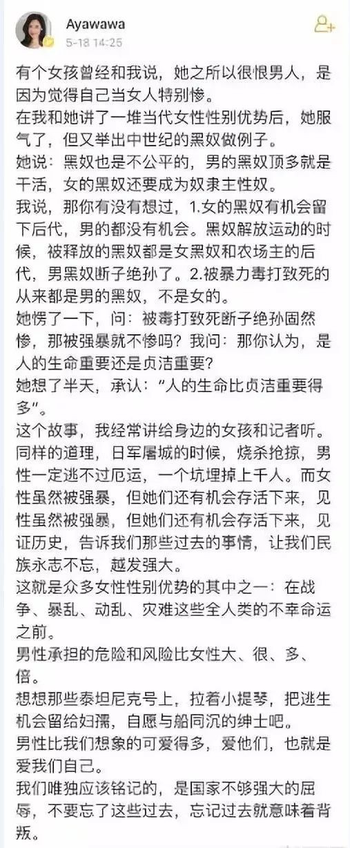 此前,这位号称“情感教主”的ayawawa因一段关于“慰安妇”的不当言论,被上千万网友围观和狂喷。