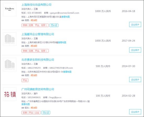据观察者网查询,目前,疑似由杨冰阳担任股东或高管的企业至少有四家,分别为上海施加化妆品有限公司、上海夏尔企业管理有限公司、北京素研生物科技有限公司,以及广州花镇教育咨询有限公司。