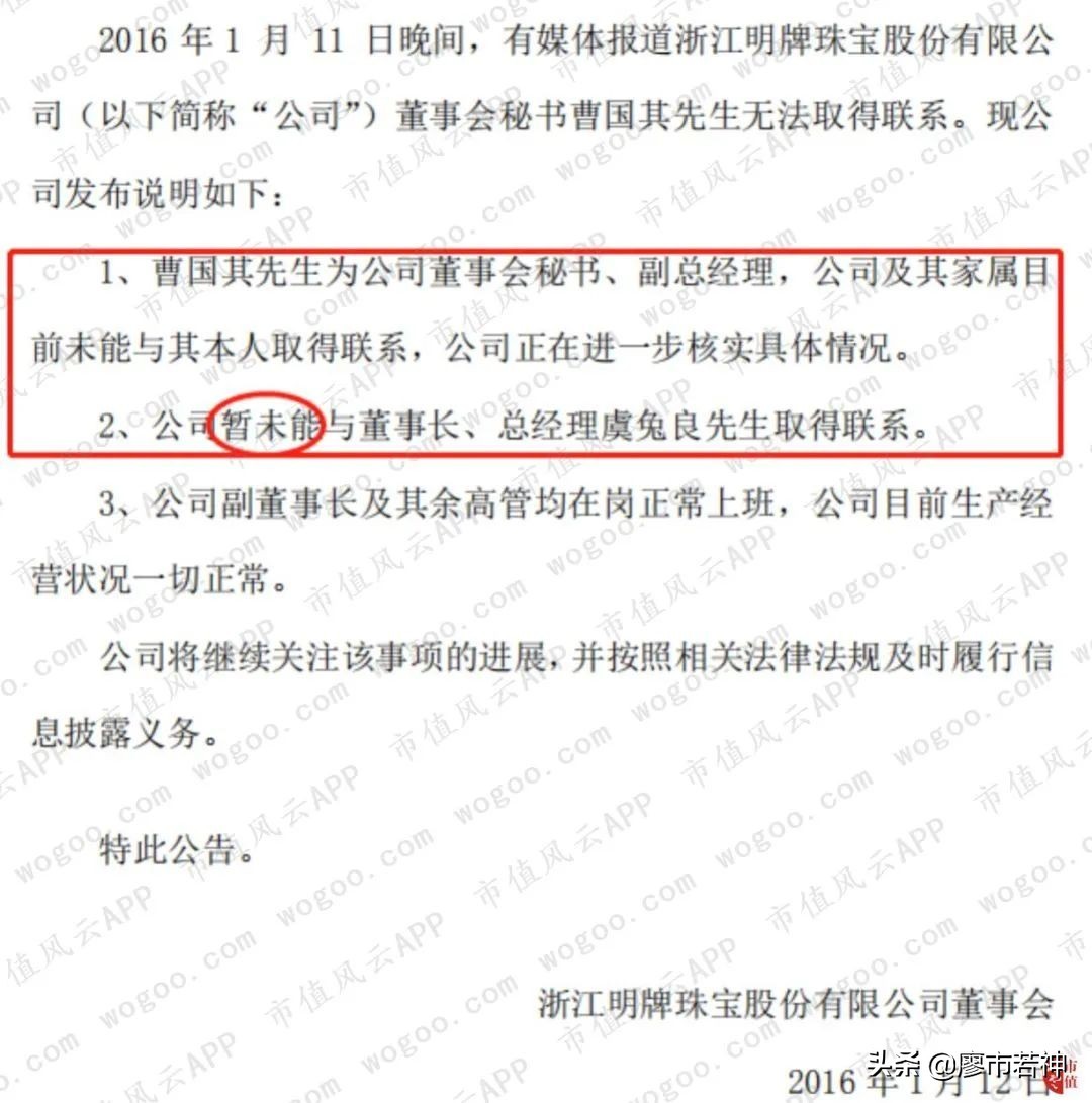 2016年随着徐翔案相关涉案上市公司被陆续曝光,明牌珠宝董事长兼总经理虞兔良以及董秘曹国其突然人间蒸发,明牌珠宝资本游戏的真相也因此变得更加扑朔迷离。