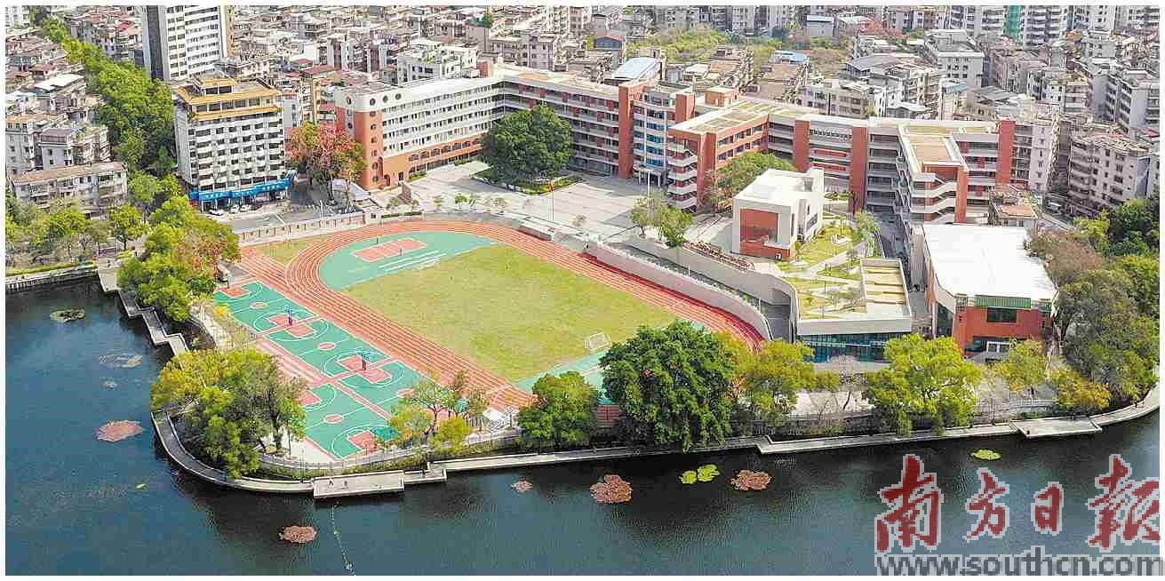 飞鹅岭下,南湖畔,重建落成的惠州市第一中学南湖校区在阳光下格外耀眼,崭新的教学楼、图书馆、艺术楼和运动场,与湖光山色交相辉映,校园面貌焕然一新。