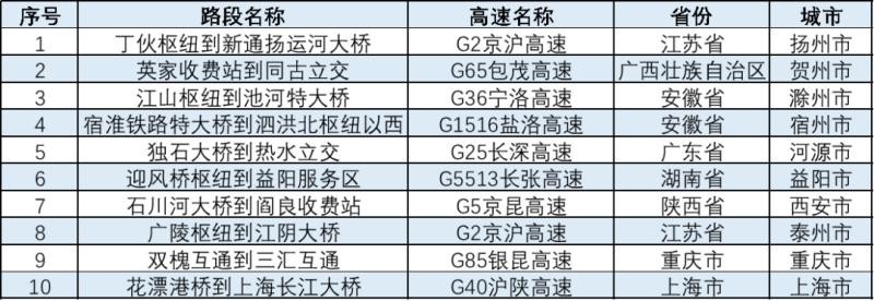 春节期间,全国高速公路预计易发生拥堵缓行的路段,如表1所示。