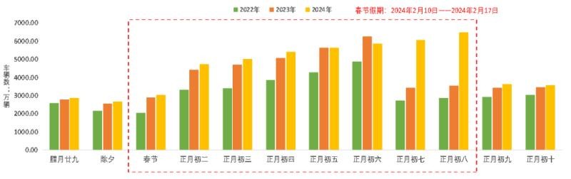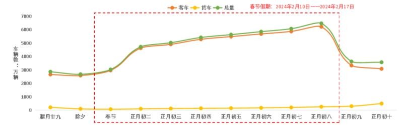 预计春节期间(含除夕),全国高速公路日均流量约为5030万辆,较2023年春节同期日均增长11.6%左右。整个春节流量峰值出现在春节假期的最后一天(正月初八),预计达6520万辆左右,创历年春节流量新高。