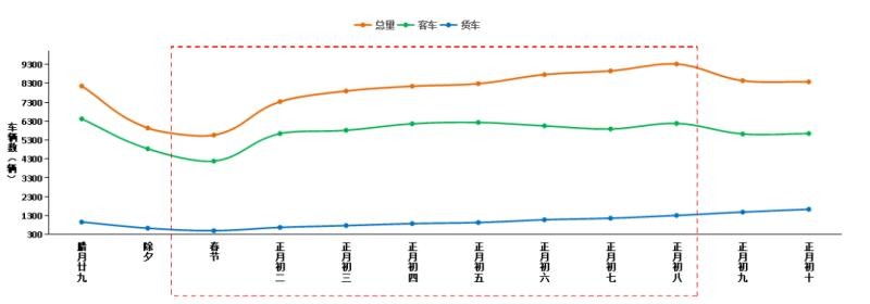 预计春节期间全国高速公路客车日均流量约4890万辆,小客车占客车比例预计达99%以上。货车流量在春节节前逐日下降,在正月初一达到最低值,春节假期之后逐渐恢复到日常水平,但货车流量同比去年预计有所增长。