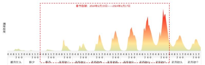 春节假期公路网流量将呈现“前低后高”的特征,除夕、初一路网流量达到假期低谷,正月初二起,路网流量逐步回升,正月初八集中返程,出现春节期间最高峰。春节期间出程与节日后期返程的潮汐特征明显,9-12时和14-19时为易发生拥堵时段。