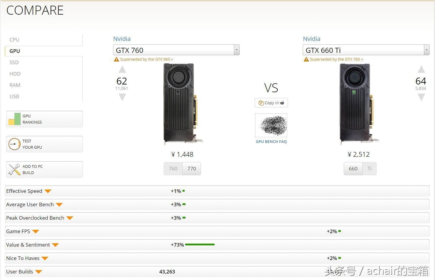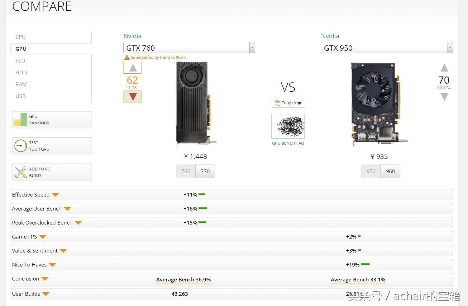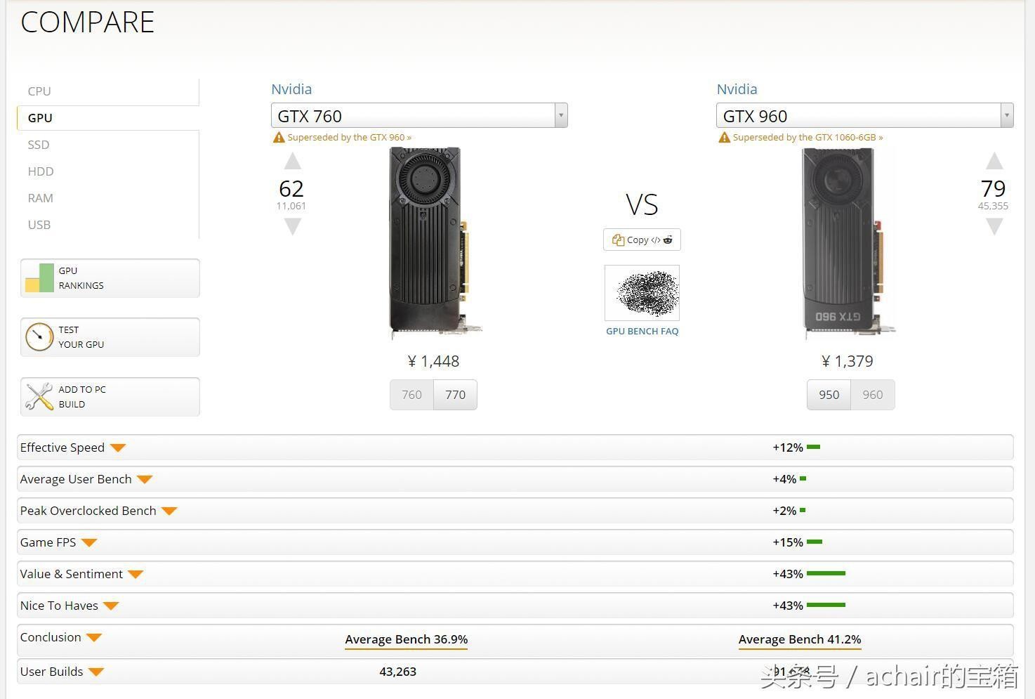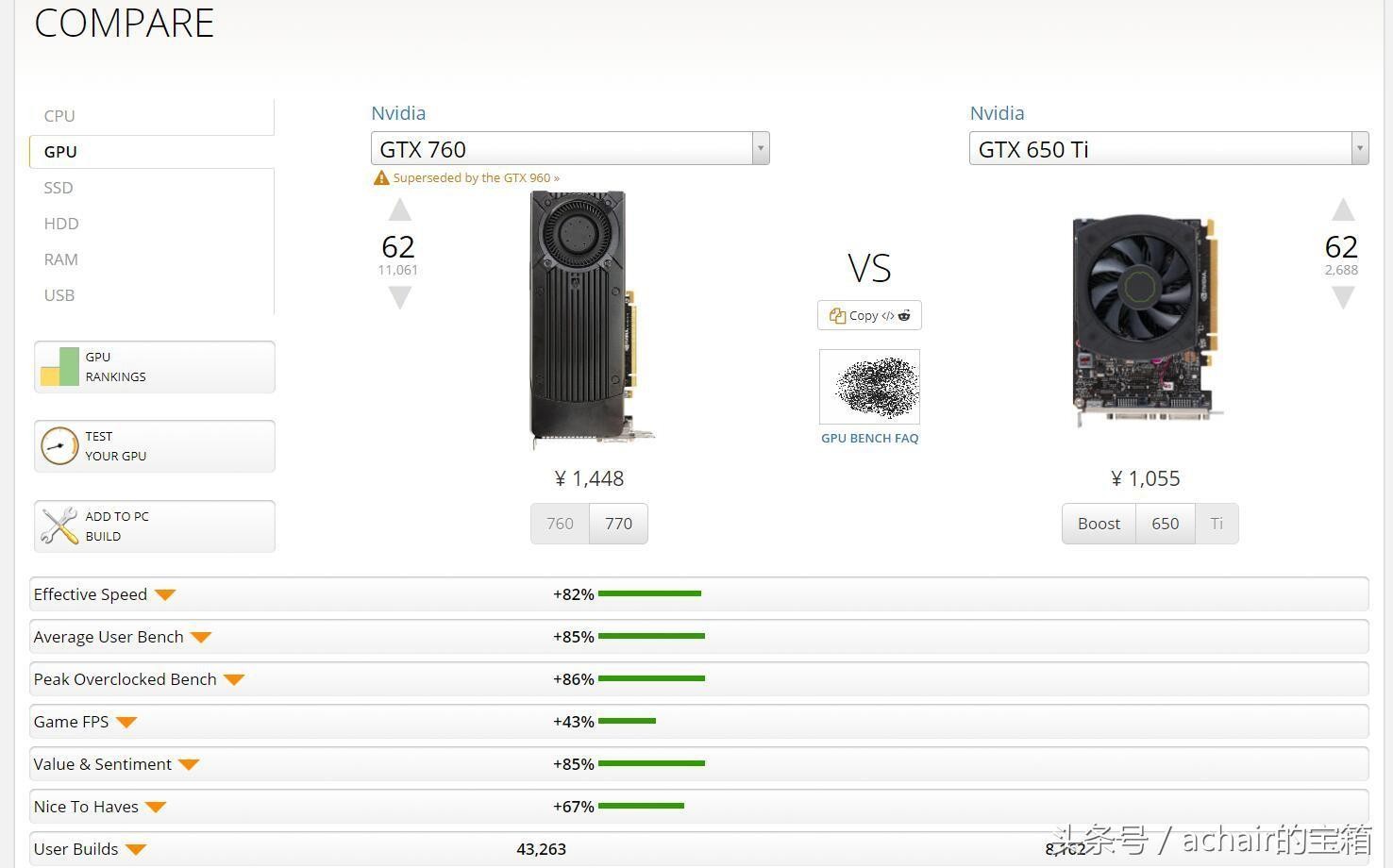 6 GTX 760对比GTX 960,弱了12%(二手价格GTX 760是500元,GTX 960是700元。)