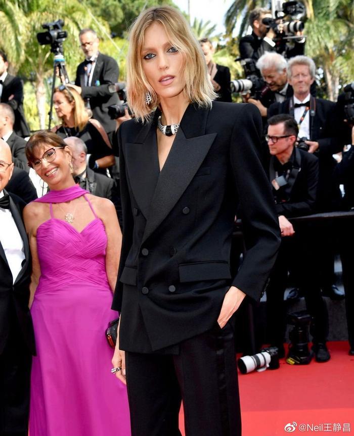 超模Anja Rubik 亮相#戛纳电影节#红毯,穿了一身黑色YSL吸烟装造型,她的中性风格真的太帅了!