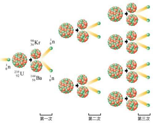 ,这是铀裂变方程式,利用中子去撞击铀235,从而产生能量,并产生更多中子,形成链式反应。