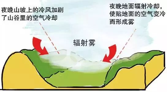 天空中的云有时就像是一床棉被,将大阳带来的能量牢牢稳固在地面,不让它们溜走。在秋冬晴朗、微风、近地面水汽充沛的造成早晨或夜间,地面的热量没有了“棉被”的保护就会迅速向外辐射,近地面空气的温度迅速下降,水汽很快饱和就凝结成雾。在日出后不久或风速加快后便会自然消散。