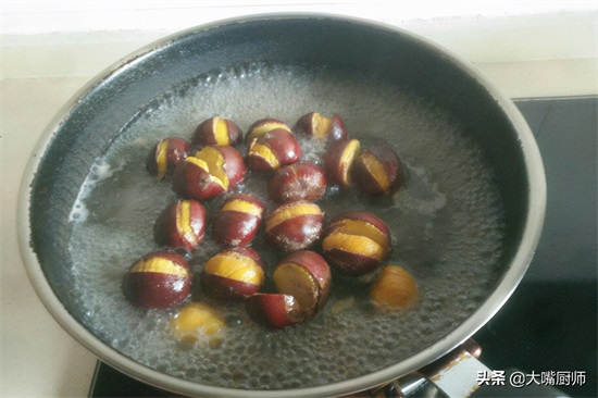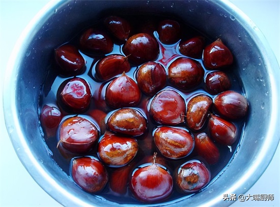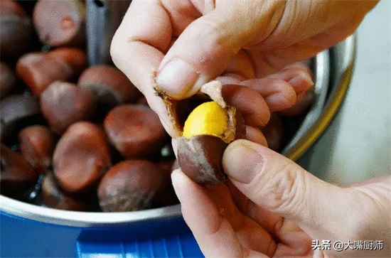 为啥这个方法能轻松剥出板栗仁呢?因为板栗先用淡盐水浸泡,吸收了很多水分,再用开水煮,水分会迅速蒸发,使板栗膨胀,本来很小的口子就被撑得很大了,用手一掰壳儿就掉了,非常快速。
