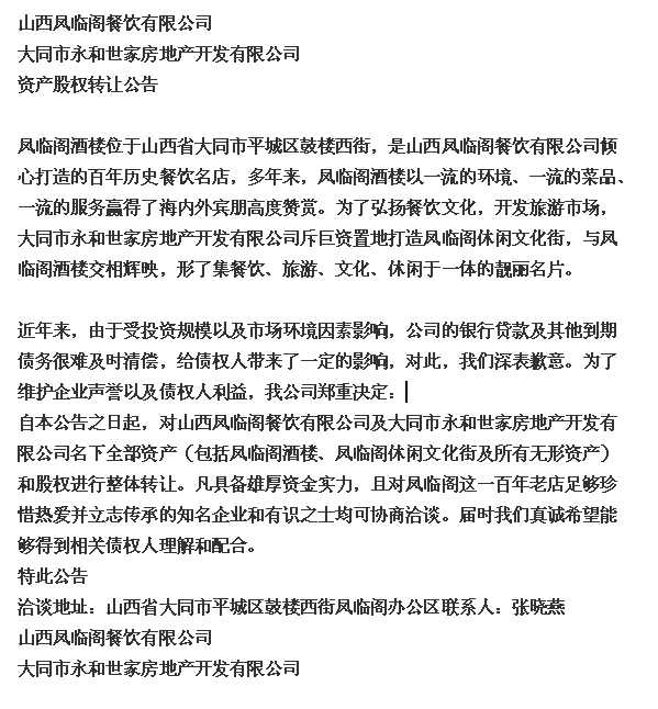 大同百年老店-凤临阁关闭转让