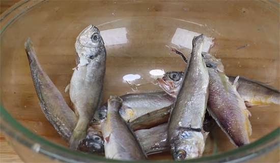 2、先将咱们准备好的鱼仔放在一个大一点的碗中,接着加入清水,清水要没过鱼仔,然后将鱼仔好好地清洗一下。鱼肚子里面的黑膜一定要刮掉,因为这是鱼腥味的来源之一,而且是最主要的来源,将黑膜去掉之后就能够起到非常有效的去腥作用。鱼仔清洗完了之后,咱们将其取出控干水分,然后放到另一个碗中。