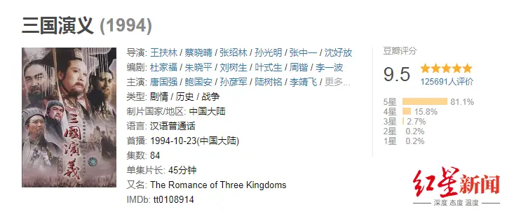 如今,94版《三国演义》已经成为经典,至今在豆瓣都有9.5的高分。