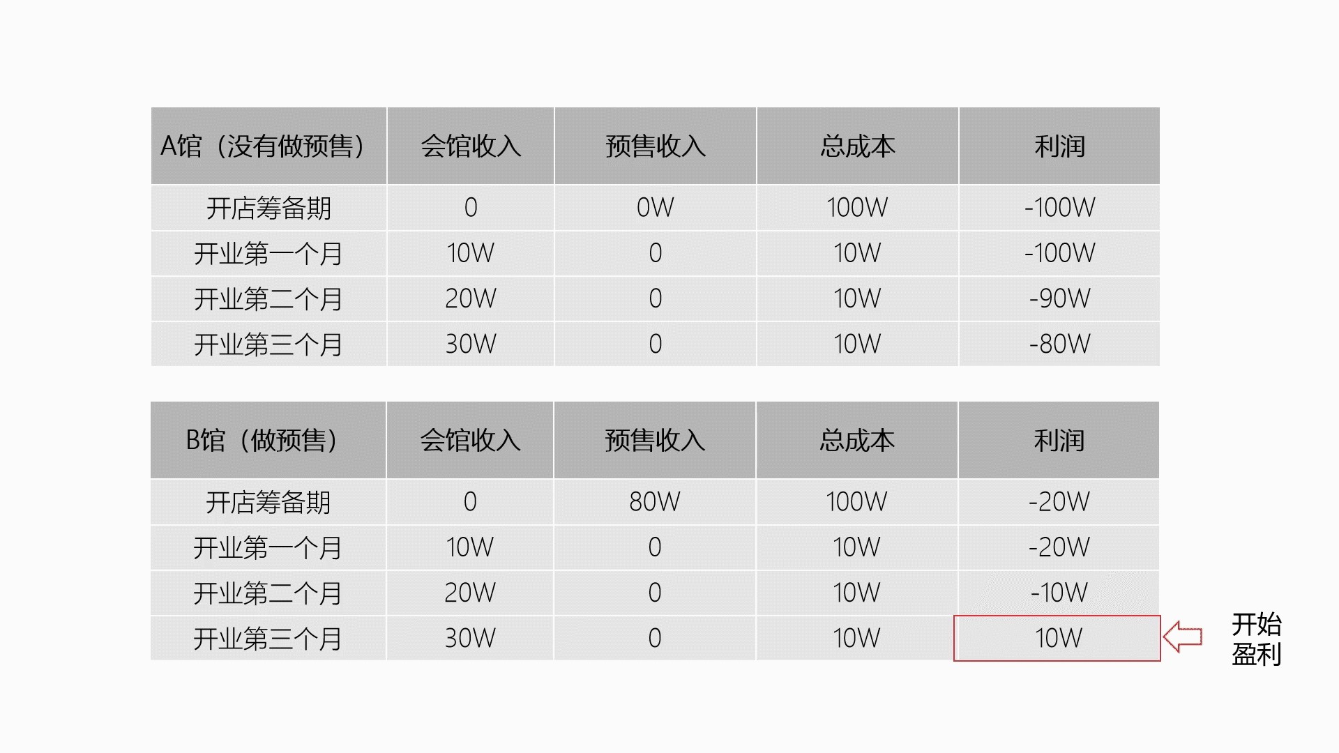两馆相比较而言,在相同成本的情况下,B会馆因为做了开馆前预售,在第三个月就开始盈利。预售期间收入建立资金池,为后期会馆做大做强打下了坚实的基础。