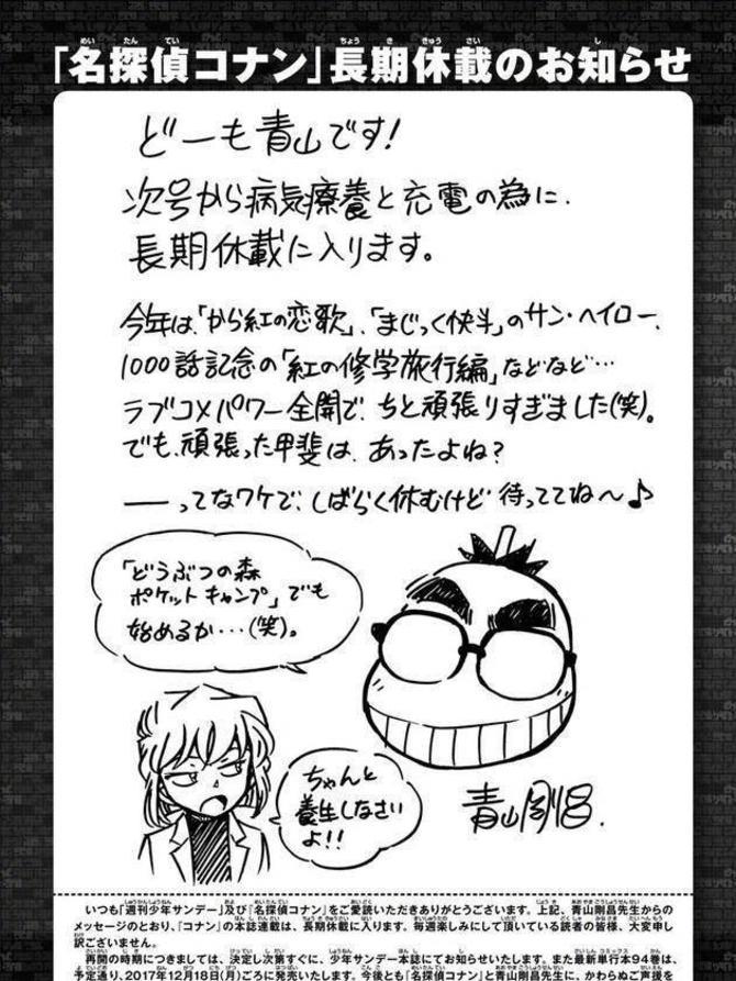 据日媒报道:《名侦探柯南》将长期休载。 近日,柯南的作者青山刚昌以漫画的形式发表声明: 大家好,我是青山!从下一期开始,因为养病,充电,柯南将进入长期休载。 今年《唐红恋歌》、《魔术快斗》、《红色修学旅行篇》等等。。。爱情喜剧能量全开,有点努力过头了,所以 休载休息一下。