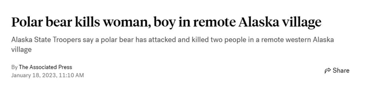 据美国广播公司1月18日报道,美国阿拉斯加州警察称,该州西部一座偏远村庄发生一起罕见的北极熊袭击人类致死事件,造成两人死亡。