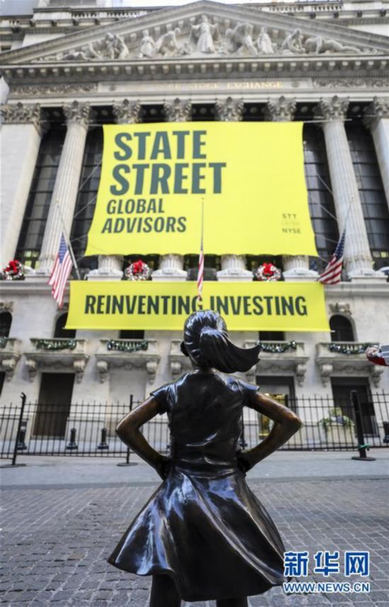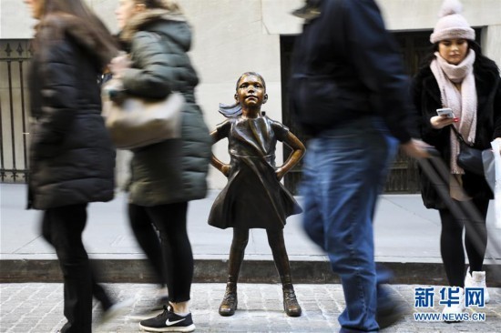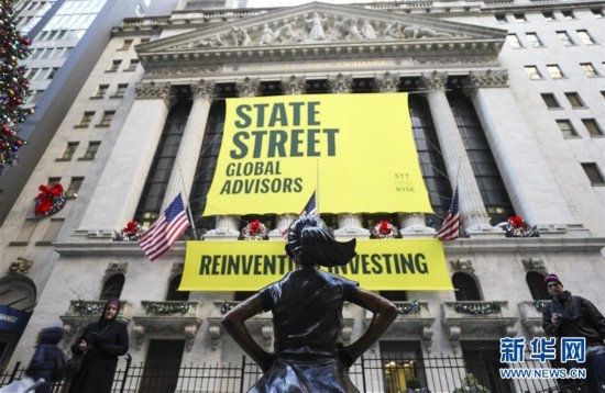 这是12月10日在美国纽约证券交易所前拍摄的“无畏女孩”铜像。 新华社记者 王迎 摄