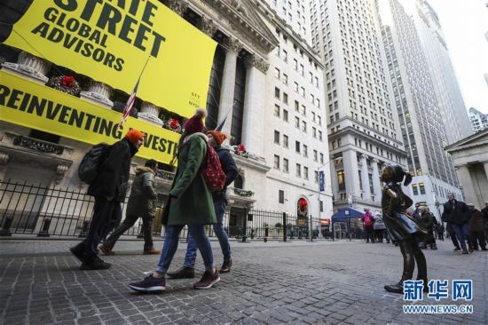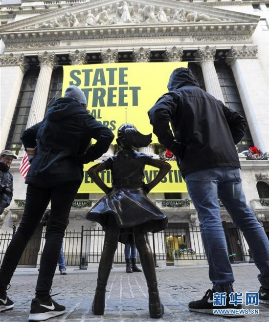 12月10日,在美国纽约,人们从纽约证券交易所前的“无畏女孩”铜像旁走过。 新华社记者 王迎 摄