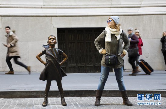 12月10日,在美国纽约,一名女士与纽约证券交易所前的“无畏女孩”铜像合影。 新华社记者 王迎 摄