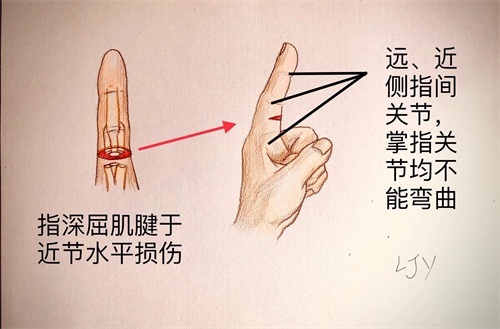 手指掌侧中节水平切伤可导致指深屈肌腱断裂,该处断裂导致远侧指间关节不能弯曲,近侧指间关节由于指浅屈肌腱的作用仍能弯曲,但力度变小。行手术吻合后极易产生粘连,导致手指弯曲挛缩,不能伸直。