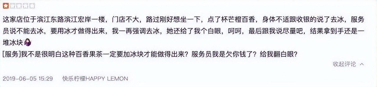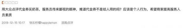2020年的一篇文章中,作者对比了几家奶茶店的差评情况,快乐柠檬是唯一一个在服务方面差评比例(39.8%)要高于产品方面差评比例(33.3%)的品牌。