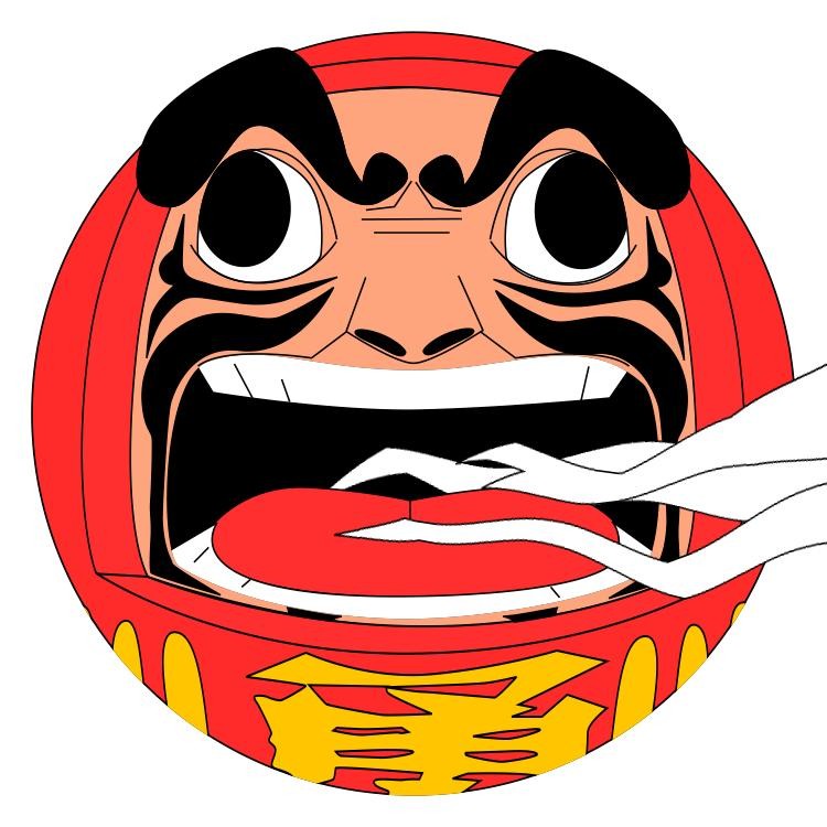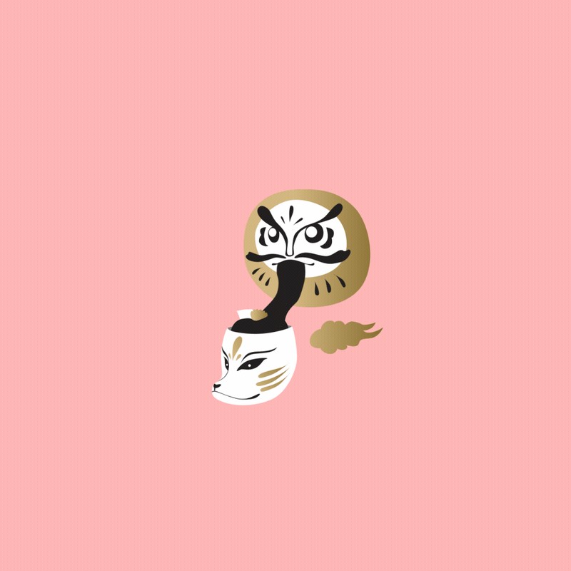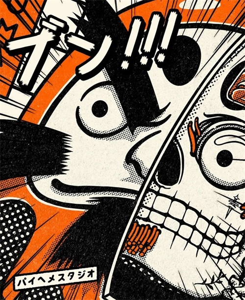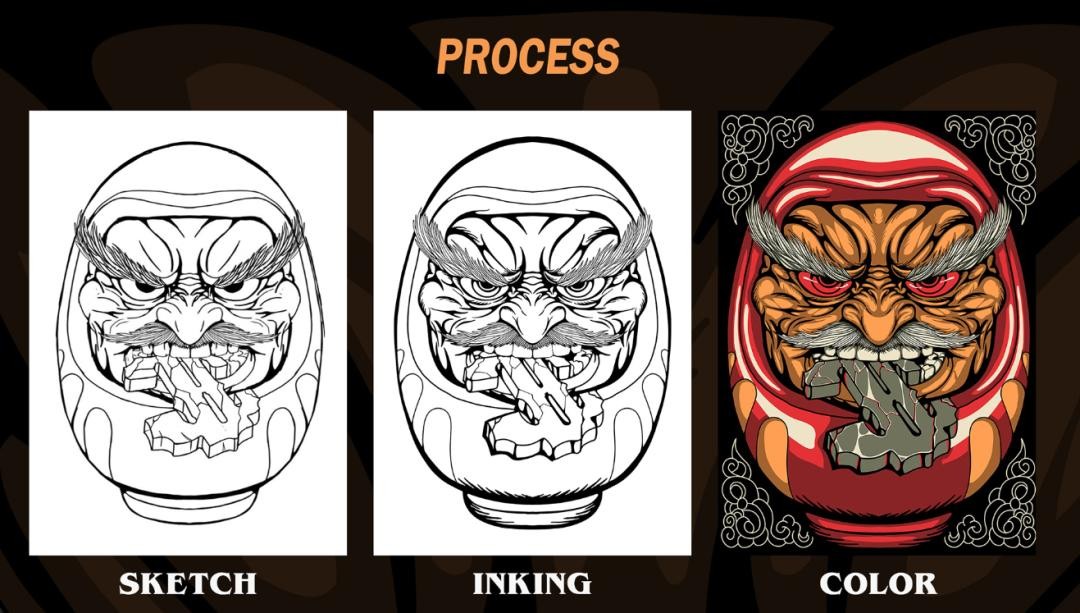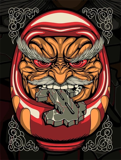 插画师将达摩与日本武士魂道结合起来,表现出一种武士的狂放硬朗风格和鬼怪的怪诞游离感,打造出日本味道十足的大气、潮流的氛围。