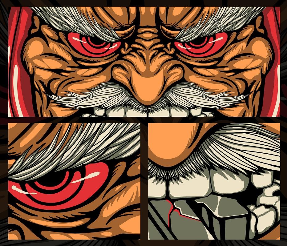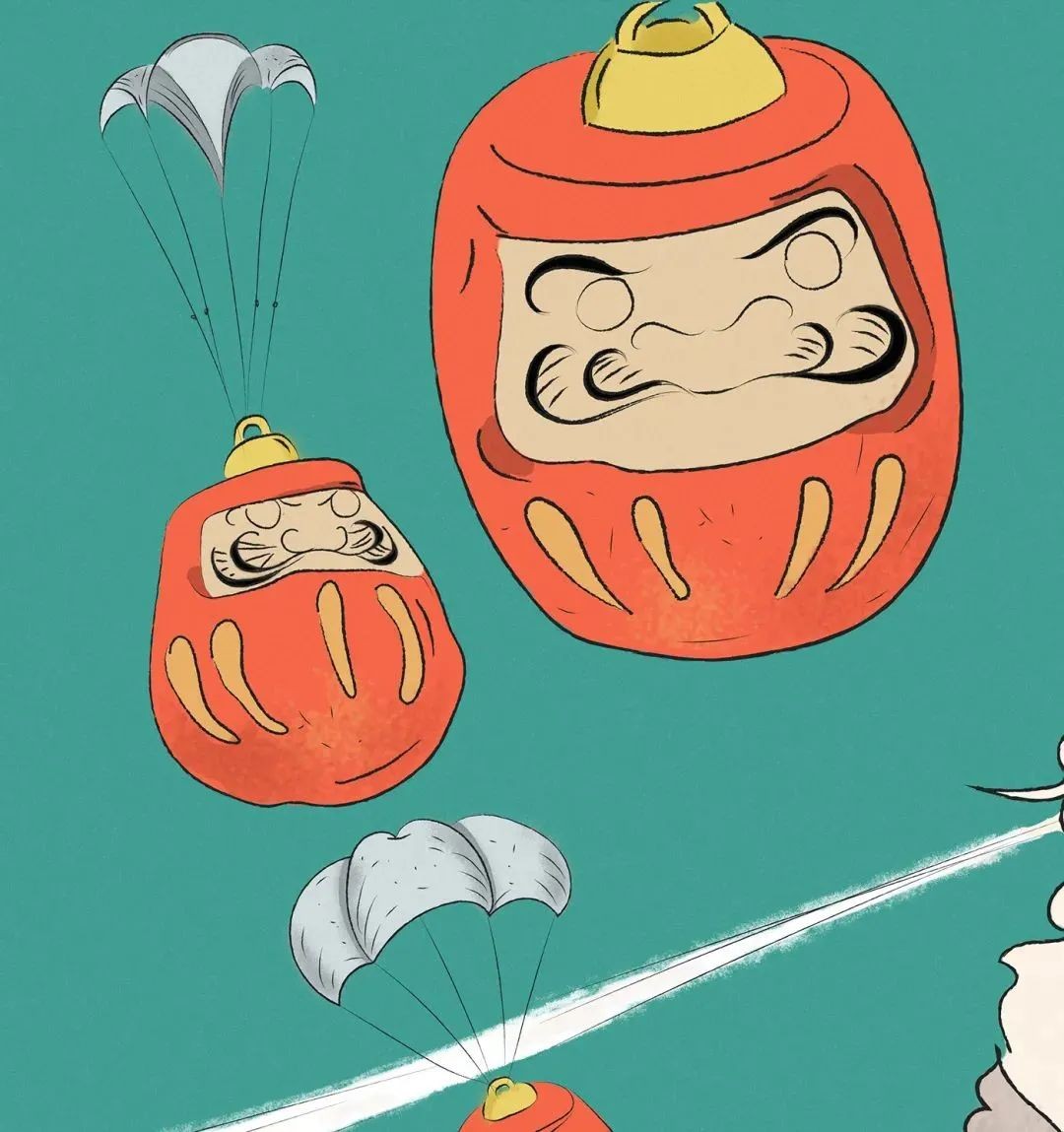 插画家将日本天狗面具的形象特征添加到达摩上,突破达摩原有形象,配上粗犷凌冽的线条刻画出出具有视觉冲击力的霸气画面。