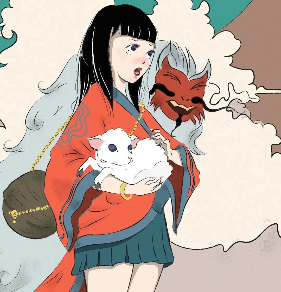 来自ilayda Yıldırım的插画逃脱达摩,描绘了一幅少女带着神兽从达摩那里逃脱的故事。