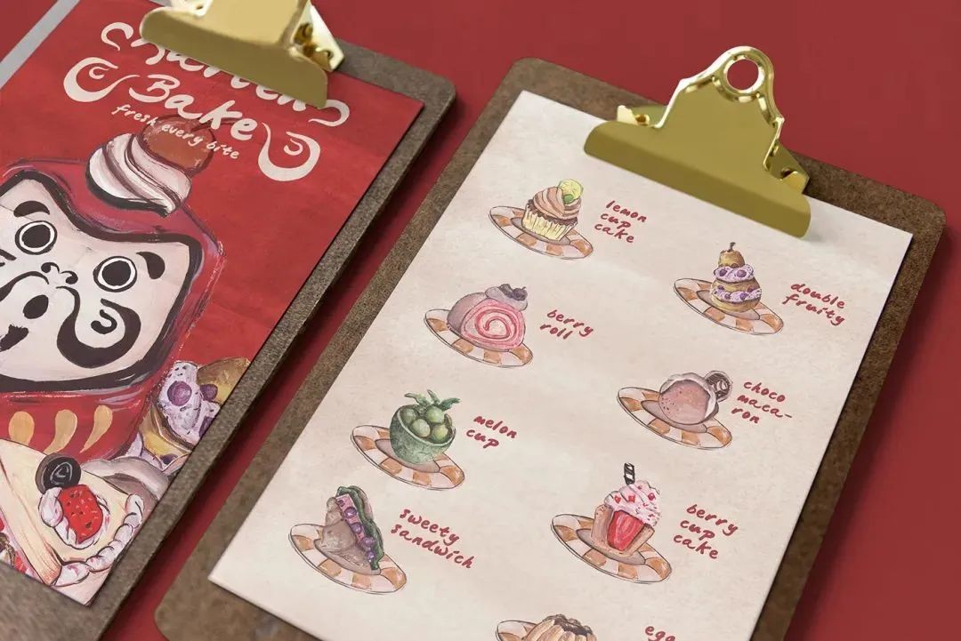为了让顾客对这家店更有亲近感,CUZ.用油画棒笔触画出蛋糕店的达摩和菜单列表。品牌字体也是手绘感觉的圆滑字体,清新温暖,这样一份用心的菜单谁看了不心动呢。