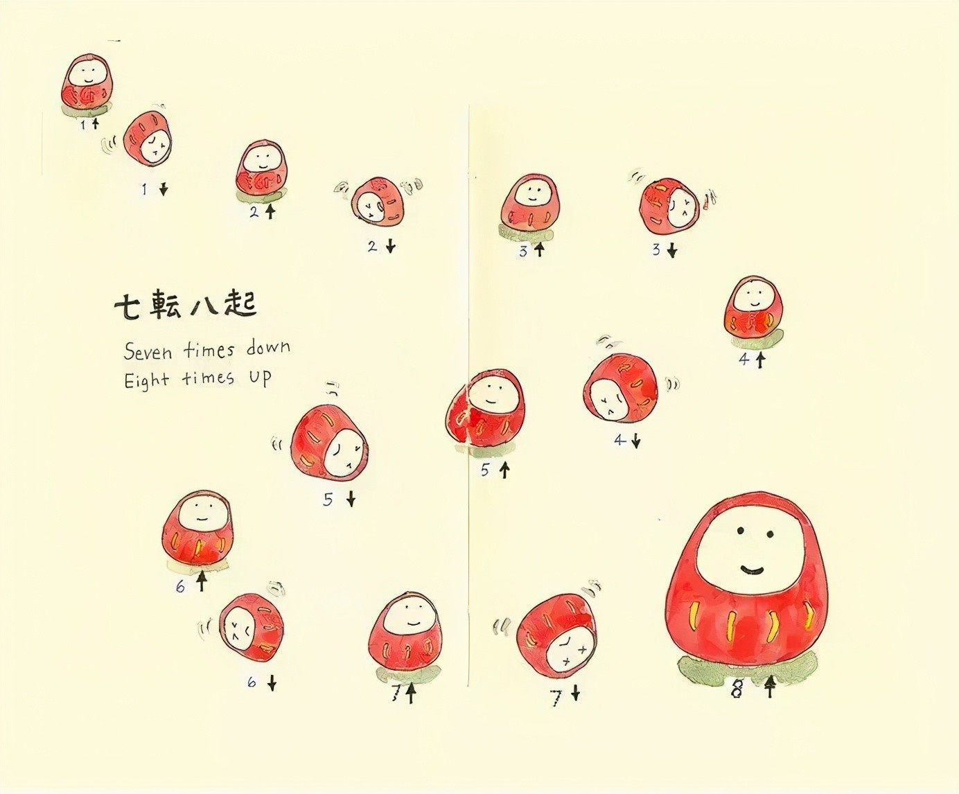 达摩因醉心于佛法而出家,晚年到河南嵩山少林寺里面壁打坐了九年之久终于悟得佛法,历经七灾八难,最后成功参悟深受人们敬重。达摩其中的关键词是“七転八起”代表着人生不可能永远一帆风顺,我们需要一种不屈不挠的精神。
